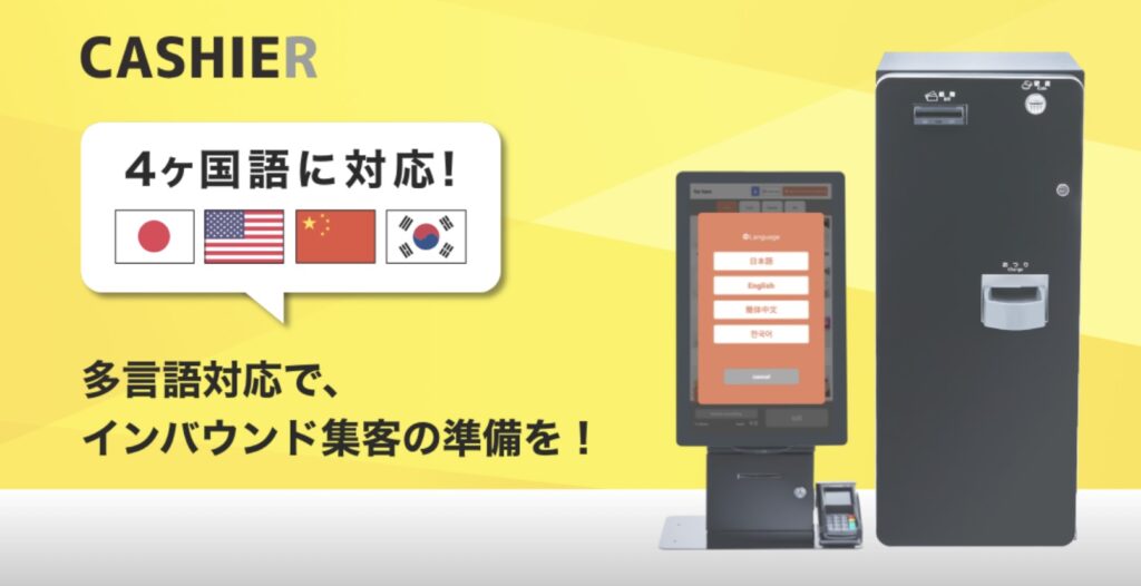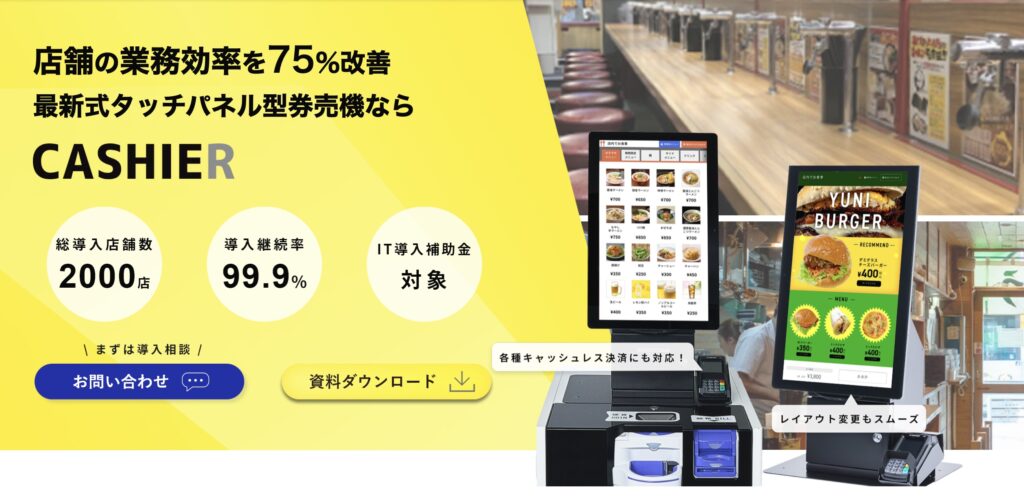 CASHIERは、飲食店や小売店向けに開発された高機能POSレジで、タッチパネル式の券売機型セルフレジも展開しています。