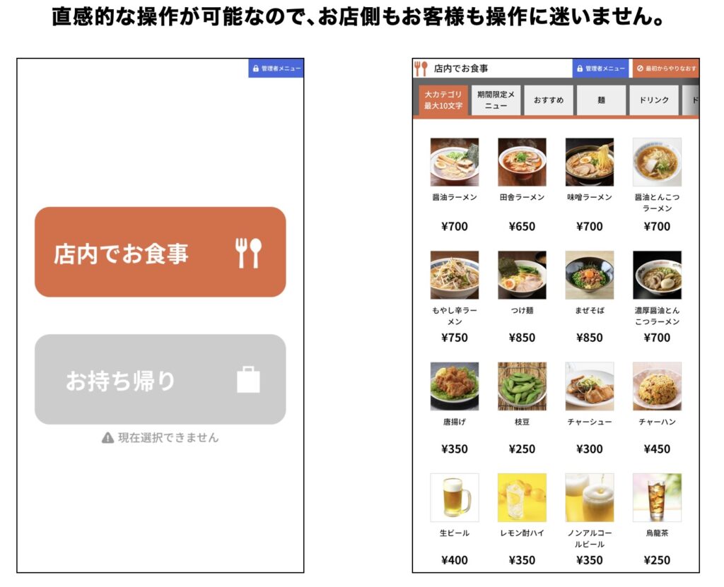 飲食店では券売機として利用でき、スタッフを介さずにスムーズな注文受付が可能です。小売店や物販イベントなどでは、セルフレジとしてレジ待ち時間の削減や人件費の削減にも貢献します。