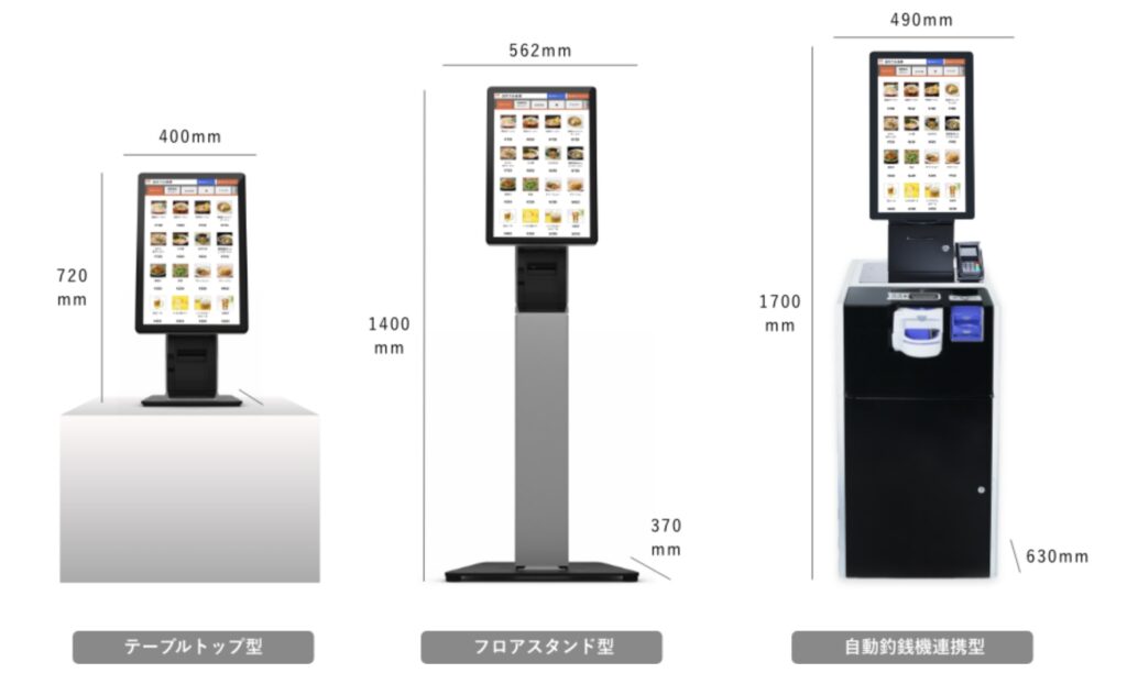 CASHIERは、卓上型・スタンド型・大型モデルなど複数サイズを展開しており、店舗スペースや導線に応じた柔軟な設置が可能です。小規模店舗では省スペース型をカウンターに設置しやすく、大規模店やフードコートでは複数決済端末を内蔵したハイエンド機を導入できます。