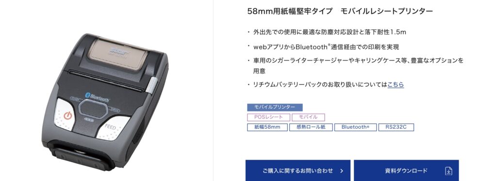 スター精密のSM-S210iは、iOS・Android端末との高い互換性を誇るモバイルプリンターです。Bluetooth接続に対応しており、スマートフォンやタブレットPOSと連携してその場でレシート発行が可能です。軽量設計(約215g)でありながら、印字速度は最大100mm/秒と快適。内蔵バッテリーで長時間稼働できるため、デリバリー・キッチンカー・屋外イベントなど、場所を問わず使用できます。耐久性と携帯性を両立した、モバイル業務向けの定番モデルです。