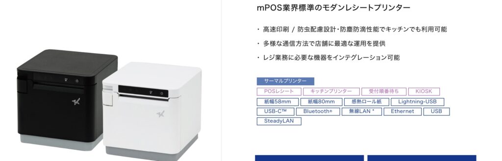 mC-Print3は、スター精密が開発した高機能・多接続対応プリンターです。USB、LAN、Bluetooth、CloudPRNTに対応し、あらゆるPOSシステムと柔軟に連携可能です。印字スピードは1秒あたり250mmと高速で、カフェや小売店などの混雑時にも素早く対応できます。防滴設計のため、水や油が気になる厨房環境にも適しており、スタイリッシュなデザインと高い耐久性を両立しています。クラウドPOSとの親和性が高く、次世代店舗運営に最適な1台です。